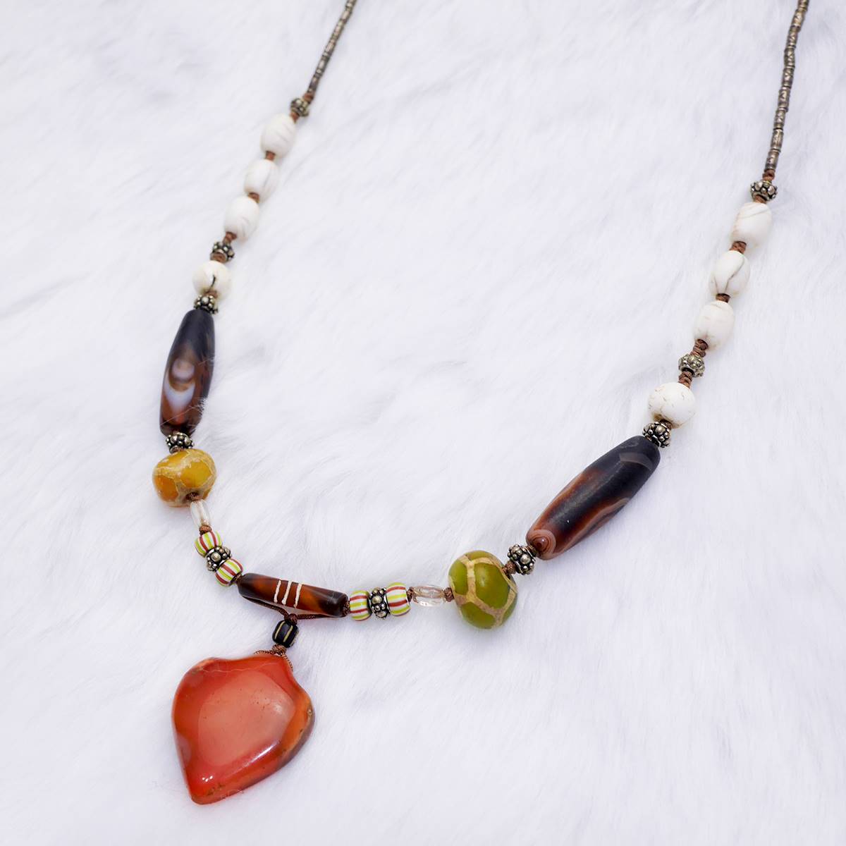 本項鍊長約30公分,以瑪瑙石珠為主要素材。 中央垂墜為盾牌型或心型的天然瑪瑙石, 內含似海草圖樣的天然紋路,相當獨特。 另外一對有如豌豆綠的鑲蝕瑪瑙珠(9-12mm)也是欣賞焦點, 上世紀在泰國南部也有考古發現相似圖樣的珠子 , 由於外觀近似足球,當地人也稱為足球珠。